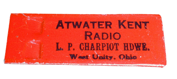 Atwater Kent promotional metal whistle, West Unity OH, c. 1927