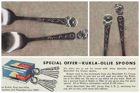 Kukla, Fran and Ollie spoons and ad, c 1952