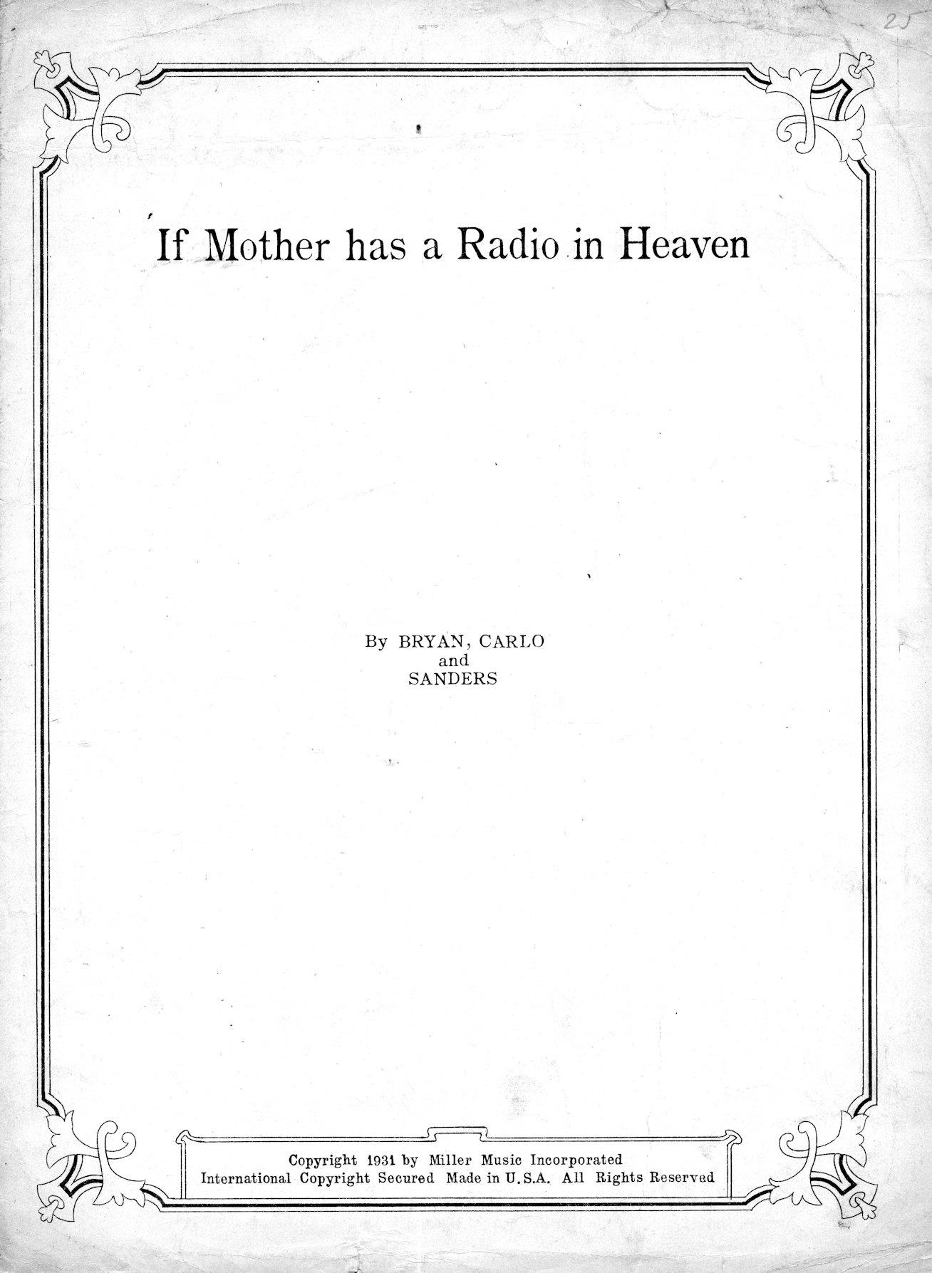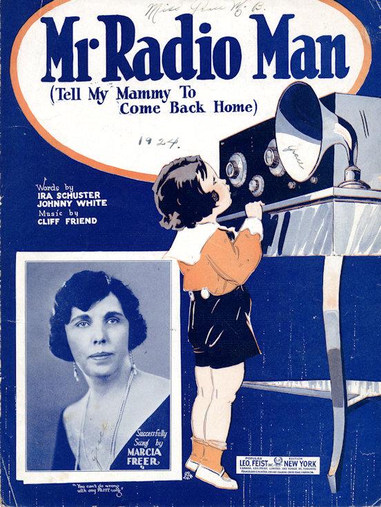 When the radio craze hit the nation in 1922 and 1923 (the number of stations grew exponentially during that period), the seemingly mystical qualities of this marvel seemed to suggest the ability to "communicate" with the ether or the heavens -- and songs like "I Wish There was a Wireless to Heaven," or "I Wish Mother Had a Radio in Heaven," raised the idea of speaking to a deceased parent. "Mr. Radio Man" was another and seemingly the most popular of any of these songs. It was recorded by Al Jolson, the Paul Whiteman orchestra, the Isham Jones orchestra and a host of others. The Jolson recording seemed to have been the most popular.