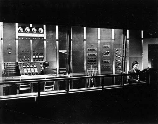 Columbia Square - Main Control woman at telex (LA Public Library coll)