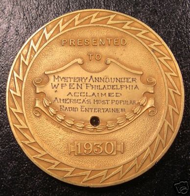 Radio Digest magazine, 1930 Diamond Meritum award medal, presented to Philadelphia WPEN's "Mystery Announcer." see also Mystery Announcer wins Diamond Meritum Award, Radio Digest, Nov, 1930)